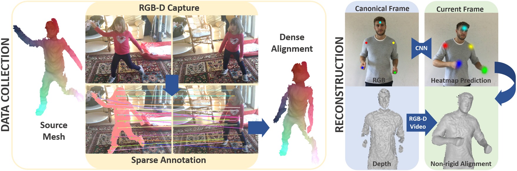 Applying data-driven approaches to non-rigid 3D reconstruction has been difficult, which we believe can be attributed to the lack of a large-scale training corpus. Unfortunately, this method fails for important cases such as highly non-rigid deformations. We first address this problem of lack of data by introducing a novel semi-supervised strategy to obtain dense inter-frame correspondences from a sparse set of annotations. This way, we obtain a large dataset of 400 scenes, over 390,000 RGB-D frames, and 5,533 densely aligned frame pairs; in addition, we provide a test set along with several metrics for evaluation. Based on this corpus, we introduce a data-driven non-rigid feature matching approach, which we integrate into an optimization-based reconstruction pipeline. Here, we propose a new neural network that operates on RGB-D frames, while maintaining robustness under large non-rigid deformations and producing accurate predictions. Our approach significantly outperforms existing non-rigid reconstruction methods that do not use learned data terms, as well as learning-based approaches that only use self-supervision.